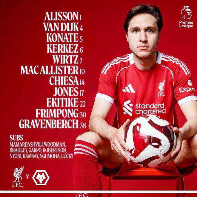利物浦首发:1-阿利松、30-弗林蓬、4-范戴克、5-科纳特、6-凯尔凯兹、38-赫拉芬贝赫、10-麦卡利斯特、17-柯蒂斯-琼斯、7-维尔茨、14-费代里科-基耶萨、22-埃基蒂克